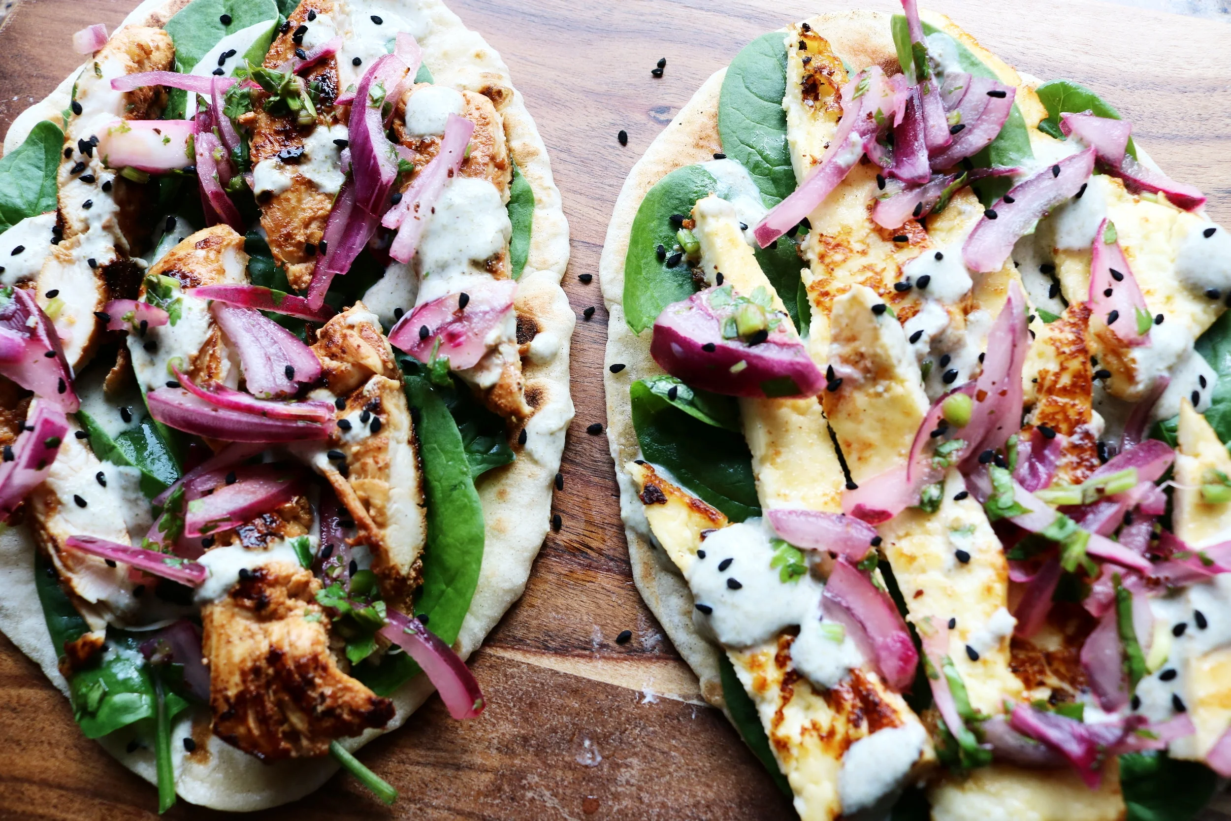 Place the naans onto a platter and drizzle some of the yogurt sauce, then top with spinach leaves, add cooked, sliced chicken onto half of the naans and pieces of cooked paneer onto the other half of the naans.